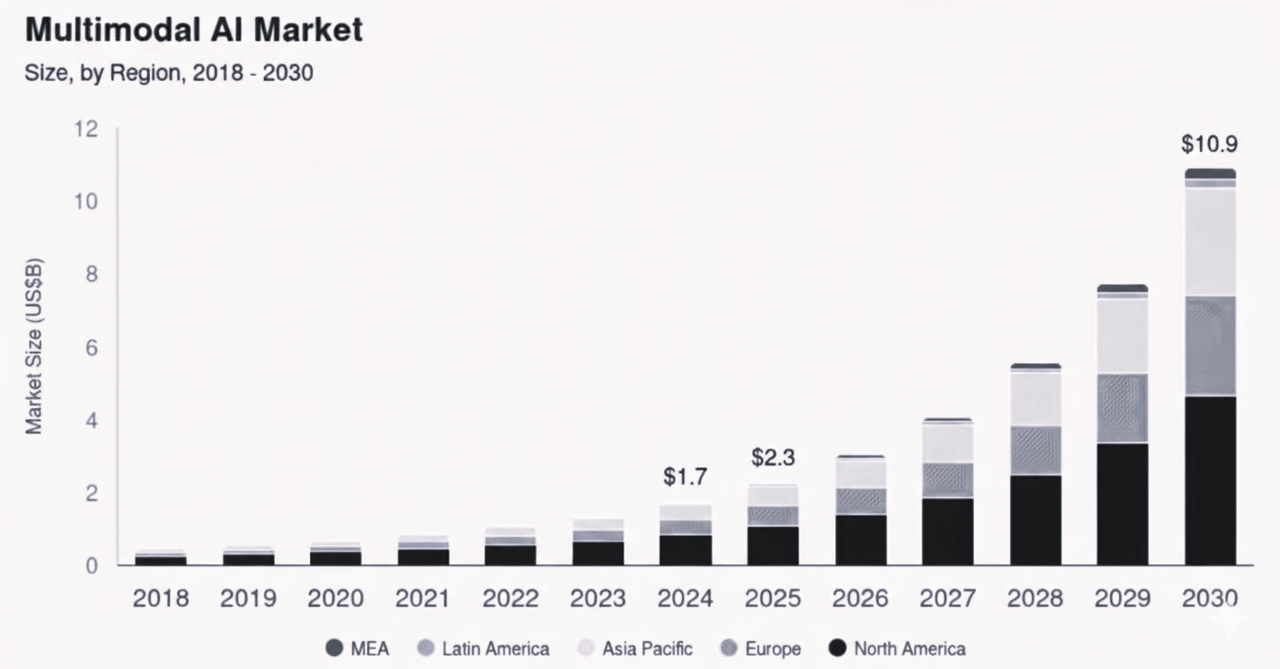 No wonder C-suite leaders are calling multimodal AI the next big inflection point. Its impact spans everything from conversational intelligence and data analytics to autonomous systems and robotics. And the momentum is undeniable because the global multimodal AI market, valued at USD 1.73 billion in 2024, is expected to surge at a 35.8% CAGR from 2024 and will reach USD 10.89 billion by 2030, signaling a rapid shift toward multisensory AI adoption across industries.